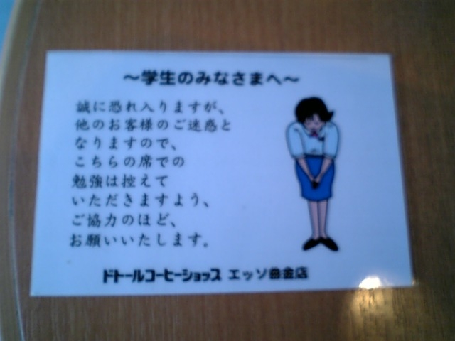 今日は9時ごろにコメダ珈琲でモーニングを食べながらこの本を読み始め、10時半ごろに込んできたので撤収。ジムで15キロ走って伝丸でラーメンを食って、シラトリでランニングシューズを買って、曲金のドトールで続きを読もうとしたテーブルにこんな注意書き。